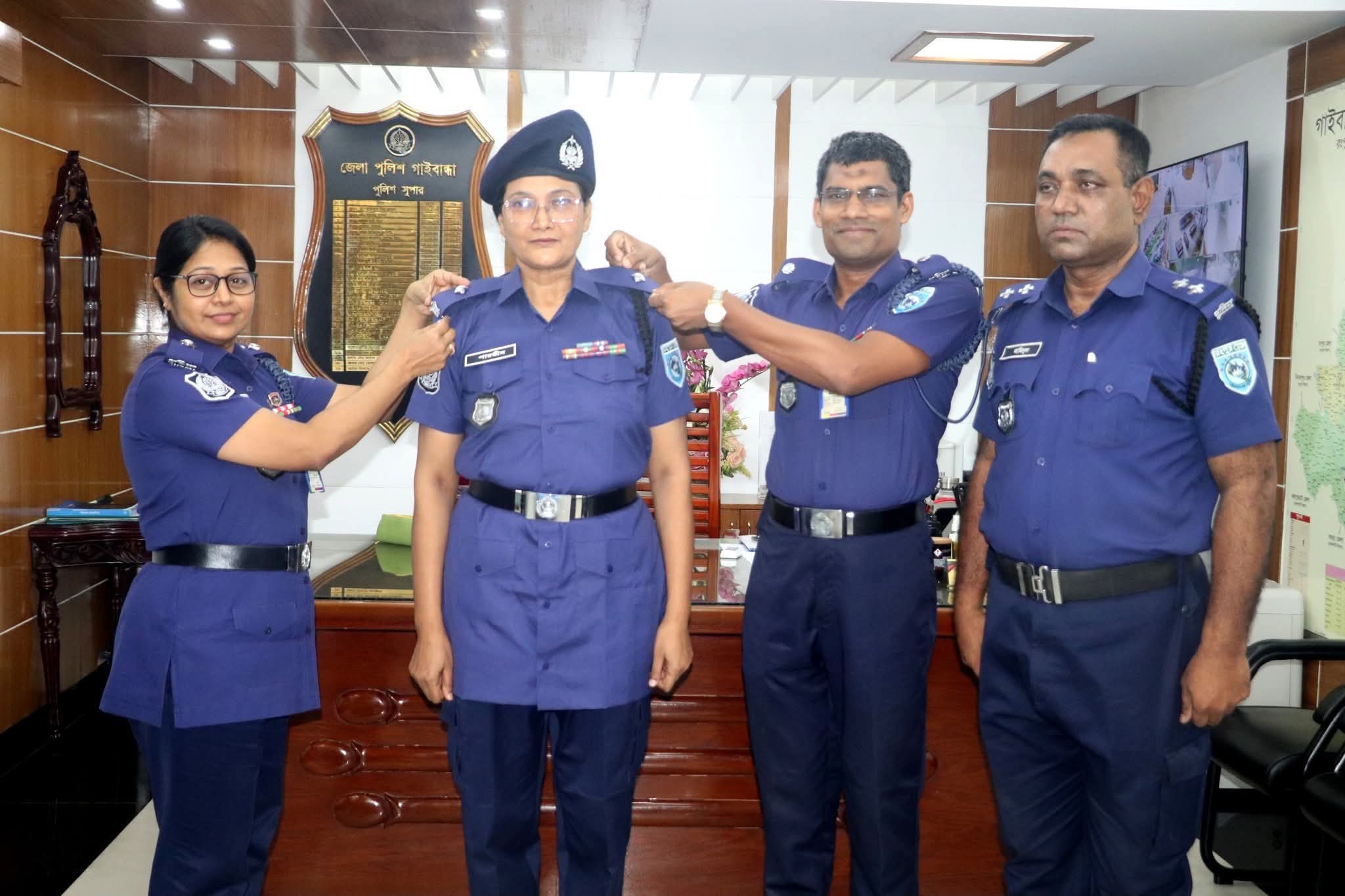 গাইবান্ধায় পদোন্নতিপ্রাপ্ত পুলিশ সদস্যের র্যাংক ব্যাজ পরালেন পুলিশ সুপার নিশাত এঞ্জেলা